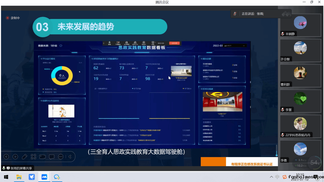 为推动我校马院高质量发展、提升我校思政课建设水平,7月12日,常州机电职业技术学院张雨老师应邀为我校做题为“坚持理论性和实践性相统一:高职院校思想政治理论课开展实践教学的思考”线上讲座。讲座由马院副院长刘静主持。