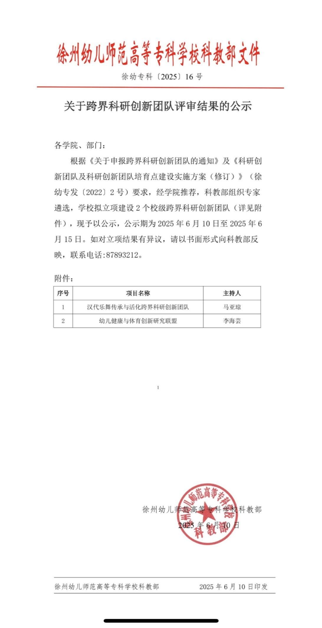 6月10日,我校在洞山校区208会议室召开校级跨界科研创新团队评审会,校党委委员、校长孙卫芳、副校长王宁、教务处处长马中英、基础部陈萍教授、科教部主任李飞进行现场评审。经综合评议,我院马亚琼老师主持申报的《汉代乐舞传承与活化》跨界科研创新团队,跨界结构清晰、研究基础扎实、目标契合科研定位,脱颖而出,喜获立项。